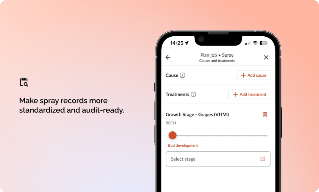 EPPO codes are shown next to crop details, BBCH stages can be selected during a spray job, and both are included in your complete spray reports, helping you keep cleaner records with less effort.
